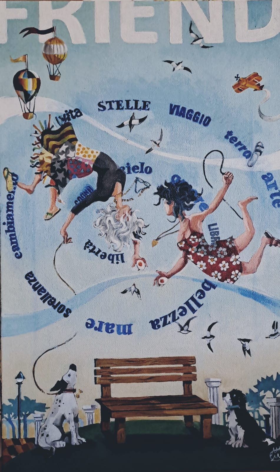 Adesso ride trascinata dal vento, le sue gambe si piegano in avanti e poi indietro e le sue braccia sembrano ali che accarezzano l’aria. Non è sola nel suo viaggio, ma ha accanto il tempo che le restituisce la sua stessa immagine con più anni. Il vestito corto a fiori e i sandali in cuoio della giovinezza hanno dato passo a scarpe infradito con plantari comodi e a gonne larghe che le coprono le gambe per il freddo. Anche la collana che portava al collo è stata sostituita da spessi occhiali da vista. Sono belle quelle due Denise, la ragazza e la donna, che ruotano insieme e hanno solo voglia di lasciarsi trasportare dal cambiamento del tempo.